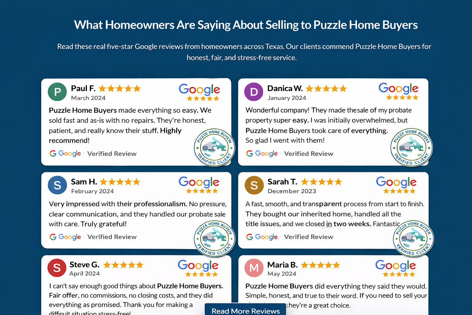 Homeowners across Texas choose Puzzle Home Buyers because we make selling simple, honest, and stress-free — even in complicated situations like inheritance, probate, title issues, or urgent timelines.